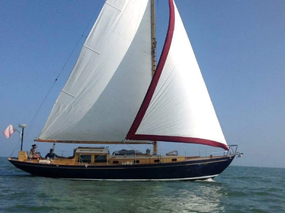 ''Ciara Madeline'' was designed by the noted naval architect John G. Alden of Massachusetts. Built by the esteemed Abeking & Rasmussen shipyard in Lemwerder, Germany, she is a steel-hulled auxiliary sloop/ cutter, measuring 44’7” in total length with a length on deck of 44’7”. Her beam is 11’8”, and she has a draft of 5‘5”. Her frame is steel ribbed, with flush welded 3/16" plate steel. Her deck was originally teak, later replaced with 1" thick marine grade plywood overlaid with 1/4" thick fiberglass/ epoxy matrix and painted with beige nonskid paint. Cabin flooring is original cork treated with coats of clear polyurethane. Her cabin top is framed with steam bent oak frames and ceiling is of stripped mahogany, layered with fiberglass and epoxy resin. Her cockpit is of large plank teak and mahogany as well as is her cabin structure. Her spars are all original boxed sika spruce, brightly varnished, as is her original spinnaker pole. The outside of the hull is painted dark blue, however originally white while she sailed as "Steel Away" and "Alibubu IV". Her rigging is all original with original marinized bronze winches and fittings throughout. She is a 7/8 fractional Marconi rig with original roller furling jib, independent of her forestay which makes rolled headsail changes quite easy. The auxiliary power is provided by a 62 horsepower Beta Marine BF2803, 5 cylinder diesel engine. The interior retains her original woodwork and equipment, with the exception of upgraded electronics, stove, and refrigeration. She also includes her original teak wheel, varnished to the brightest finish.